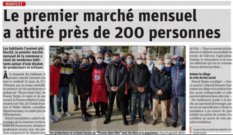 Le premier marché a eu lieu le 12 mars dernier sur la place de l'église à MONTCET (cf. Article B. BEROT dans le PROGRES).Débriefing de notre premier marché : une météo plutôt clémente, des visiteurs enthousiastes et des exposants accueillants.